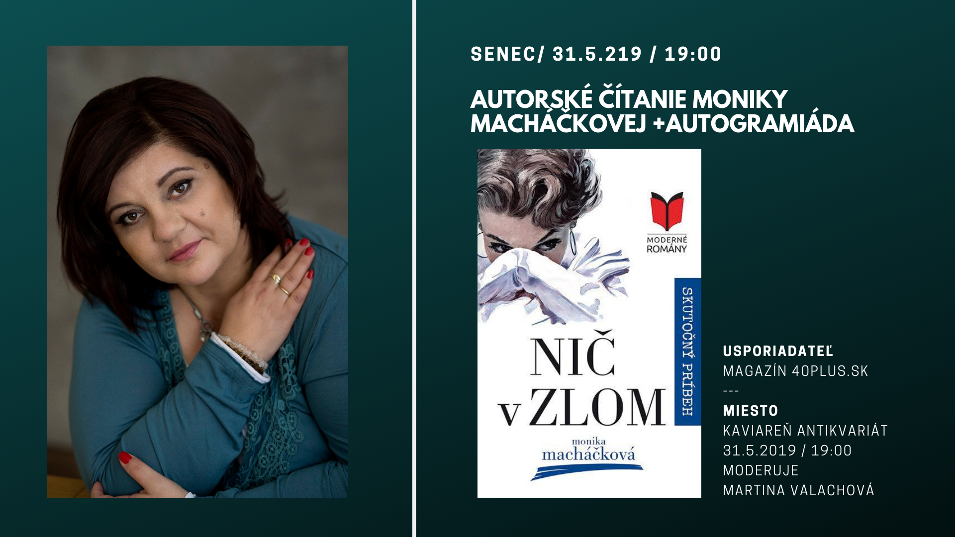 Ak už ste si knihu Nič v zlom už kúpili, prineste si ju so sebou. Monika vám ju rada podpíše, alebo napíše venovanie (ak je kniha osobným darom pre vašu spriaznenú dušu).