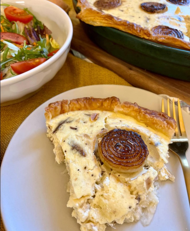 Quiche z lístkového cesta s údenou makrelou a opečenými cibuľkami